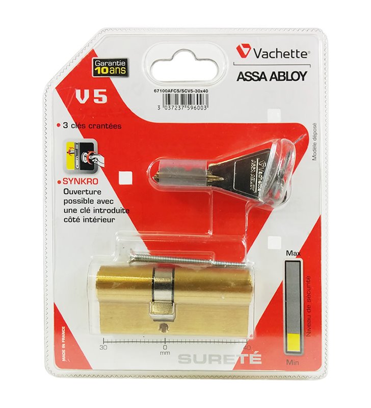 Serrure A2p VACHETTE,,Sureté,,3 Clés,,30-40 Mm,Canon,Barillet Cylindre Sécurité L'emballage doit être le même que celui de l'objet vendu en magasin, sauf si l'objet a été emballé par le fabricant dans un emballage non adapté pour la vente au détail, comme une boîte non imprimée ou une poche en plastique. 3. Cylindre de sécurité pour porte barillet 40 x 30 mm Alpha Bricard 3 clés. Livraison gratuite. Prix de comparaison. 49,90 €. 23,80 €. Ajouter · Cylindre... Cylindre serrure Vachette CY110 de sécurité.5 goupilles anti crochetage, anti perçage, anti bumping et arrachement.Certification aux plus hautes exigences norme EN1303 :2015 après de nombreux tests.Livré avec 3 clés réversibles par cylindre serrure.Breveté jusqu'en 2036, reproduction des clés impossible sans votre carte unique.Fabrication en laiton massif pour plus de résistance à... Consulter l'annonce du vendeur pour avoir plus de détails., Matériau: laiton Type: verrou,cylindre,barillet,canon à bouton Cylindre de porte Vachette RADIALis A2P de très haute sécurité